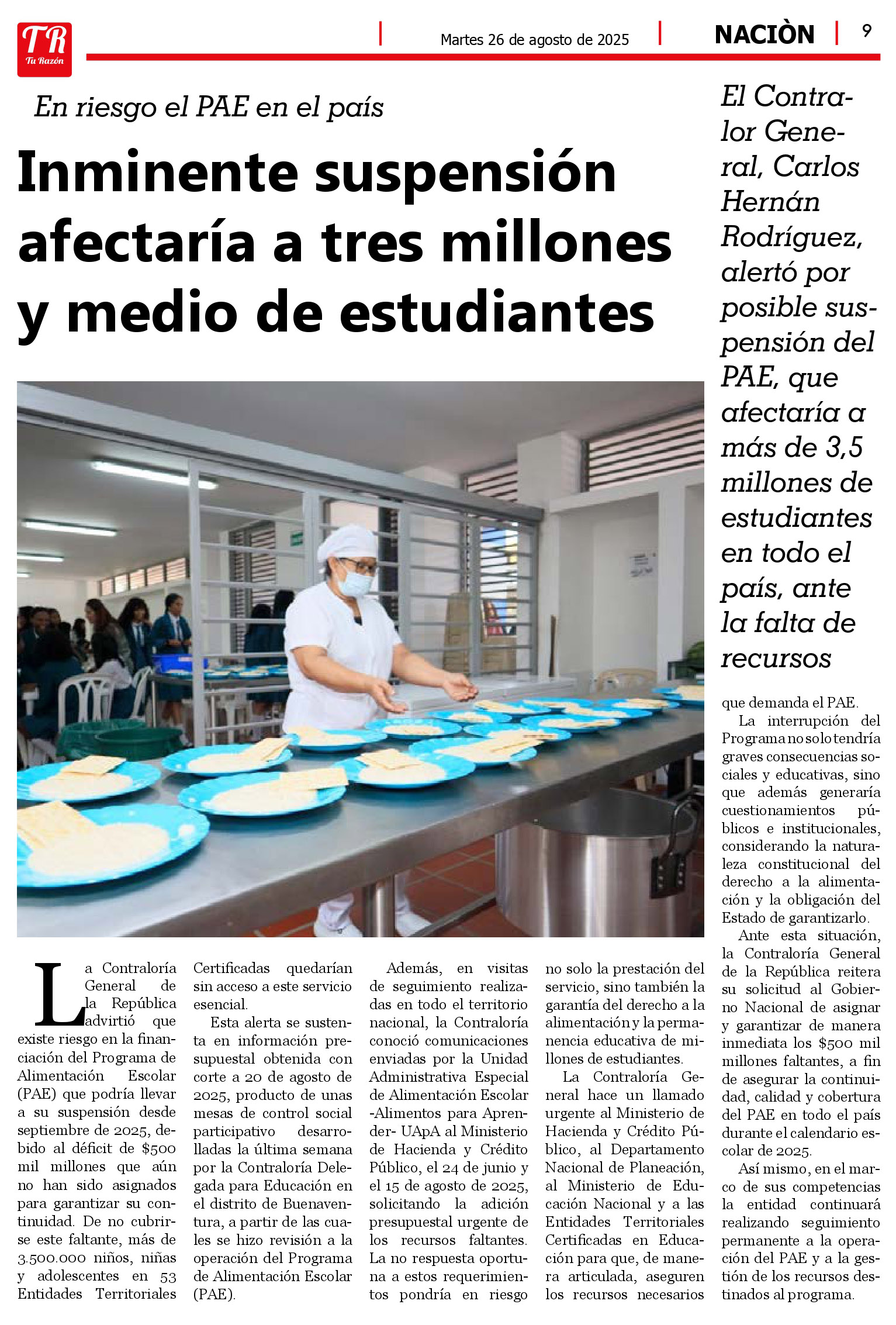 Alimentación Escolar (PAE) que podría llevar a su suspensión desde septiembre de 2025, debido al déficit de $500