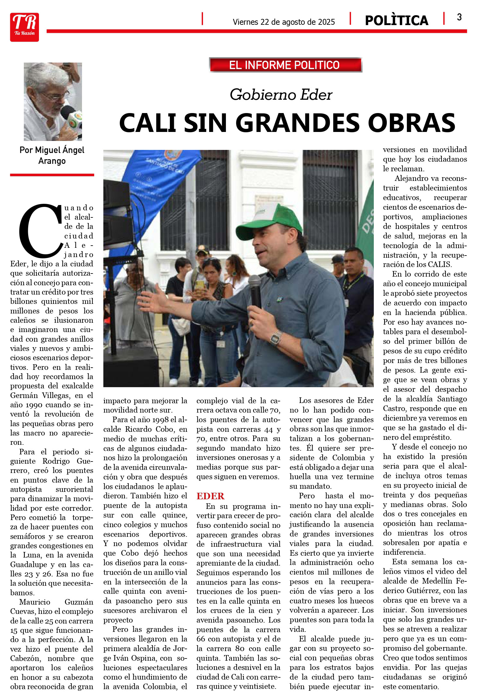 Cu a n d o el alcalde de la ciudad A l e j a n d ro Eder, le dijo a la ciudad que solicitaría autorización al concejo para contratar un crédito por tres billones quinientos mil millones de pesos los caleños se ilusionaron e imaginaron una ciudad con grandes anillos viales y nuevos y ambiciosos escenarios deportivos. Pero en la realidad hoy recordamos la propuesta del exalcalde Germán Villegas, en el año 1990 cuando se inventó la revolución de las pequeñas obras pero las macro no aparecieron.
