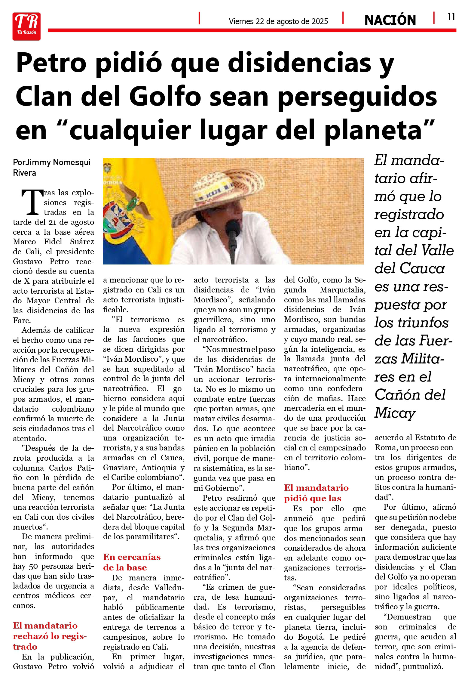 Tras las explosiones registradas en la tarde del 21 de agosto cerca a la base aérea Marco Fidel Suárez de Cali, el presidente Gustavo Petro reaccionó desde su cuenta de X para atribuirle el acto terrorista al Estado Mayor Central de