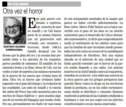El estallido de los camiones frente a la Base Aérea de Cali, nos ha vuelto a traer de sopetón a los mismos escenarios de la guerra de los narcos que vivimos hace 30 años.