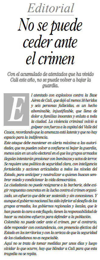 Este ataque debe mantener en alerta máxima a las autoridades, que no pueden volver a confiarse ni bajar la guardia, menos aún en un año electoral en el que los grupos armados ilegales intentarán presionar con bombazos y actos de terror.