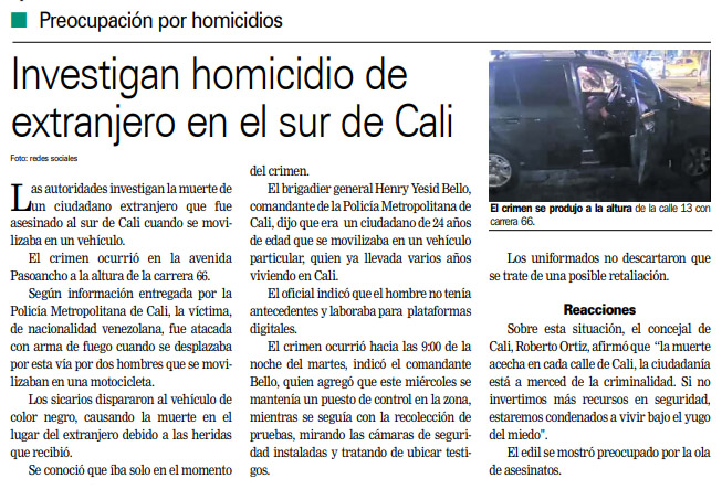 Investigan homicidio de extranjero en el sur de Cali, pág5, Diario Occidente,
