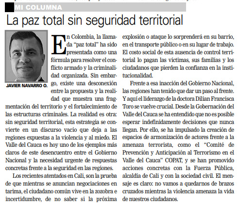 Opinión - La paz total sin seguridad territorial, pág4, Diario Occidente