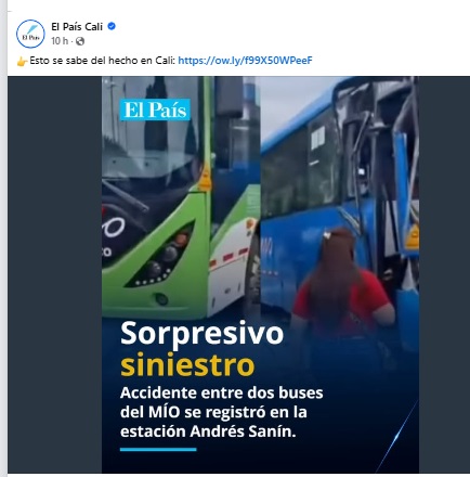 Un accidente entre dos buses del sistema MÍO fue registrado hace pocos minutos dentro de la estación Andrés Sanín, en el oriente de Cali. La situación se dio a conocer por medio de un video en el que se muestra a los dos vehículos, y los daños materiales que se presentaron tras el accidente.