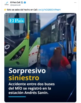 Un accidente entre dos buses del sistema MÍO fue registrado hace pocos minutos dentro de la estación Andrés Sanín, en el oriente de Cali. La situación se dio a conocer por medio de un video en el que se muestra a los dos vehículos, y los daños materiales que se presentaron tras el accidente.