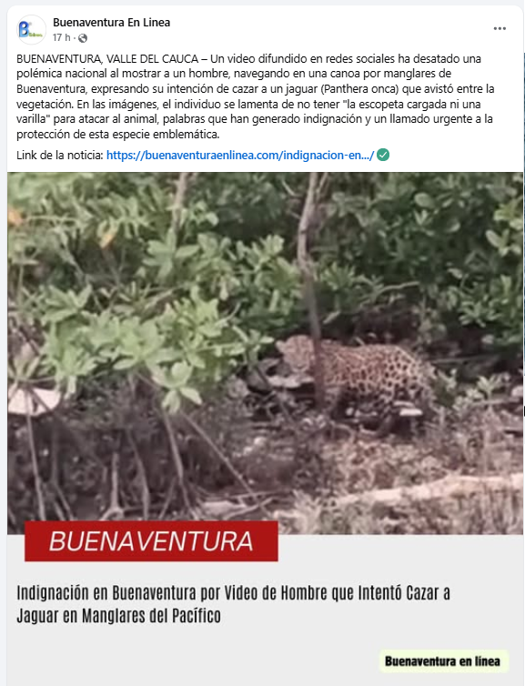 Un video difundido en redes sociales ha desatado una polémica nacional al mostrar a un hombre, navegando en una canoa por manglares de Buenaventura, expresando su intención de cazar a un jaguar (Panthera onca) que avistó entre la vegetación. En las imágenes, el individuo se lamenta de no tener "la escopeta cargada ni una varilla" para atacar al animal, palabras que han generado indignación y un llamado urgente a la protección de esta especie emblemática.