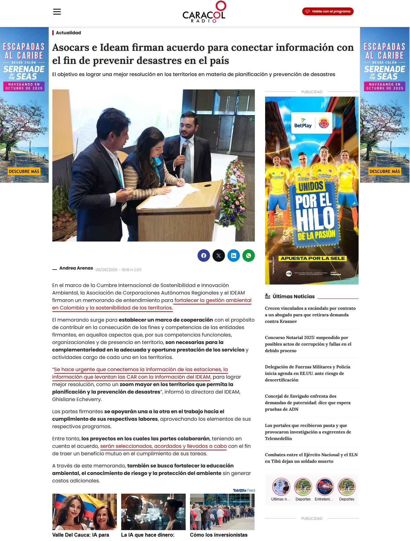 En el marco de la Cumbre Internacional de Sostenibilidad e Innovación Ambiental, ASOCARS y el IDEAM firmaron un memorando de netendimiento para fortalecer la gestión ambiental en Colombia y la sostenibilidad de los territorios.