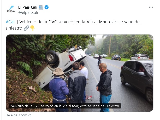 En la mañana del 17 de septiembre se volcó un vehículo perteneciente a la CVC en la Vía al Mar, concretamente en el kilómetro 14. El siniestro se presentó rondando las 10:00 a.m., según informaron las autoridades.El vehículo se volcó y quedó a un costado de la vía, provocando congestión en el sector por algunos momentos.