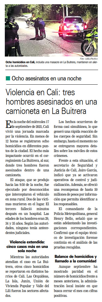 Violencia en Cali, 3 hombres asesinados en una camioneta en La Buitrera, pág2, Diario Occidente