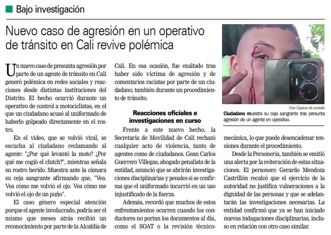 Un nuevo caso de presunta agresión por parte de un agente de tránsito en Cali generó polémica en redes sociales y reacciones desde distintas instituciones del Distrito.