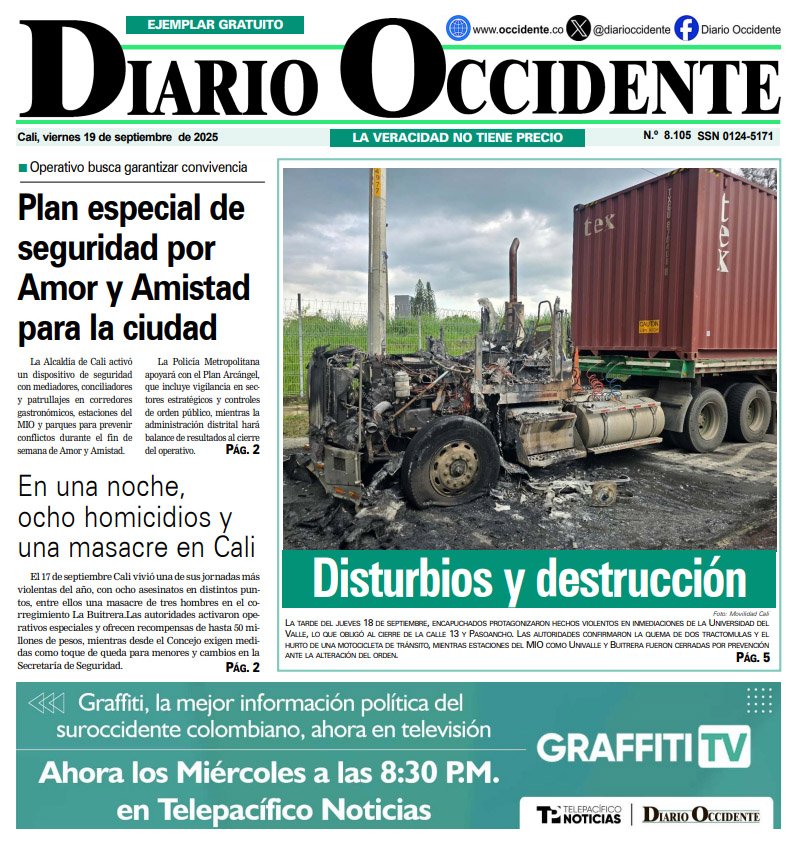 LA TARDE DEL JUEVES 18 DE SEPTIEMBRE, ENCAPUCHADOS PROTAGONIZARON HECHOS VIOLENTOS EN INMEDIACIONES DE LA UNIVERSIDAD DEL VALLE, LO QUE OBLIGÓ AL CIERRE DE LA CALLE 13 Y PASOANCHO. LAS AUTORIDADES CONFIRMARON LA QUEMA DE DOS TRACTOMULAS Y EL HURTO DE UNA MOTOCICLETA DE TRÁNSITO, MIENTRAS ESTACIONES DEL MIO COMO UNIVALLE Y BUITRERA FUERON CERRADAS POR PREVENCIÓN ANTE LA ALTERACIÓN DEL ORDEN.