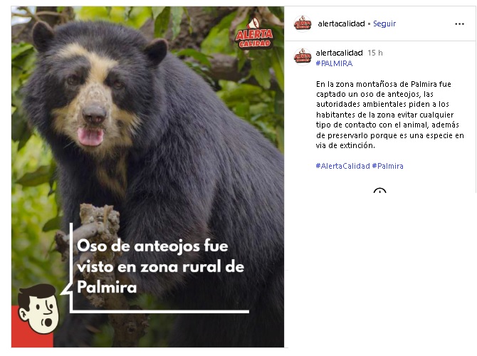 Oso de anteojos avistado en Palmira, Radio Calidad IG