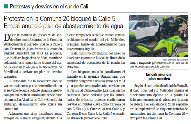 Protesta bloqueó la calle 5, Emcali anunció plan de abastecimiento de agua, pág6, Diario Occidente