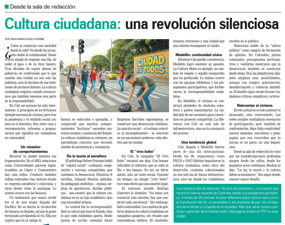 ¿ Cómo se construye una sociedad desde la calle? No desde las urnas, sino desde la cotidianidad. Desde el acto simple de respetar una fila, de ceder el paso o de no tirar basura. Tras décadas de seguir planes de gobierno, he confirmado que lo que cambia una ciudad no son solo las políticas, sino la decisión de sus habitantes de portarse distinto. La cultura ciudadana empieza cuando reconocemos que también tenemos una parte de la responsabilidad. En Cali ese proceso ha sido intermitente. A principios de los 90 fuimos ejemplo nacional de civismo, pero tras la pandemia y el estallido social caímos en el desorden. Hoy, entre caos y recomposición, volvemos a preguntarnos qué significa ser ciudadanos en comunidad