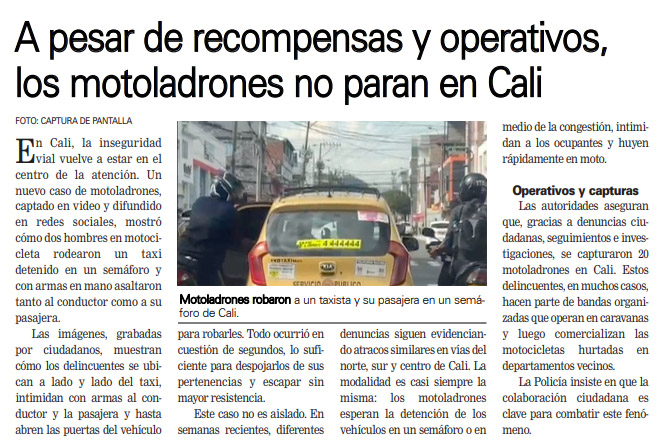 En Cali, la inseguridad vial vuelve a estar en el centro de la atención. Un nuevo caso de motoladrones, captado en video y difundido en redes sociales, mostró cómo dos hombres en motocicleta rodearon un taxi detenido en un semáforo y con armas en mano asaltaron tanto al conductor como a su pasajera.