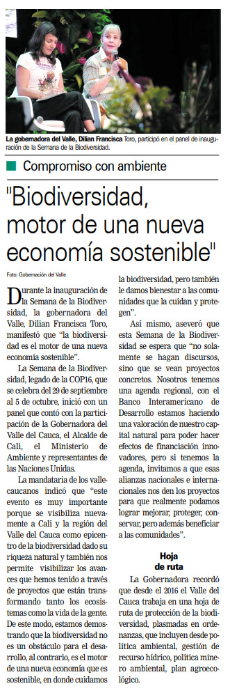 Durante la inauguración de la Semana de la Biodiversidad, la gobernadora del Valle, Dilian Francisca Toro, manifestó que “la biodiversidad es el motor de una nueva economía sostenible”.