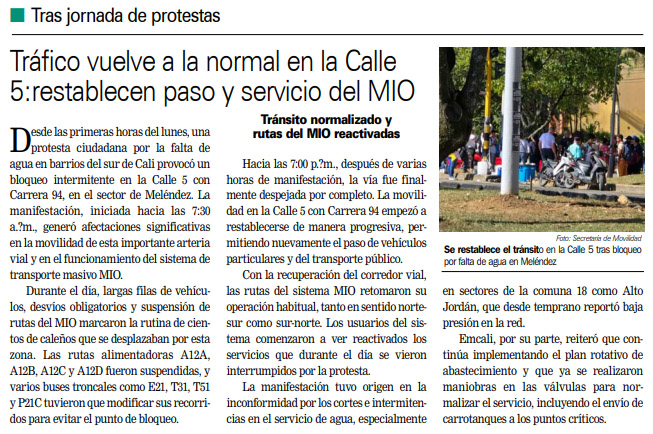 Desde las primeras horas del lunes, una protesta ciudadana por la falta de agua en barrios del sur de Cali provocó un bloqueo intermitente en la Calle 5 con Carrera 94, en el sector de Meléndez.