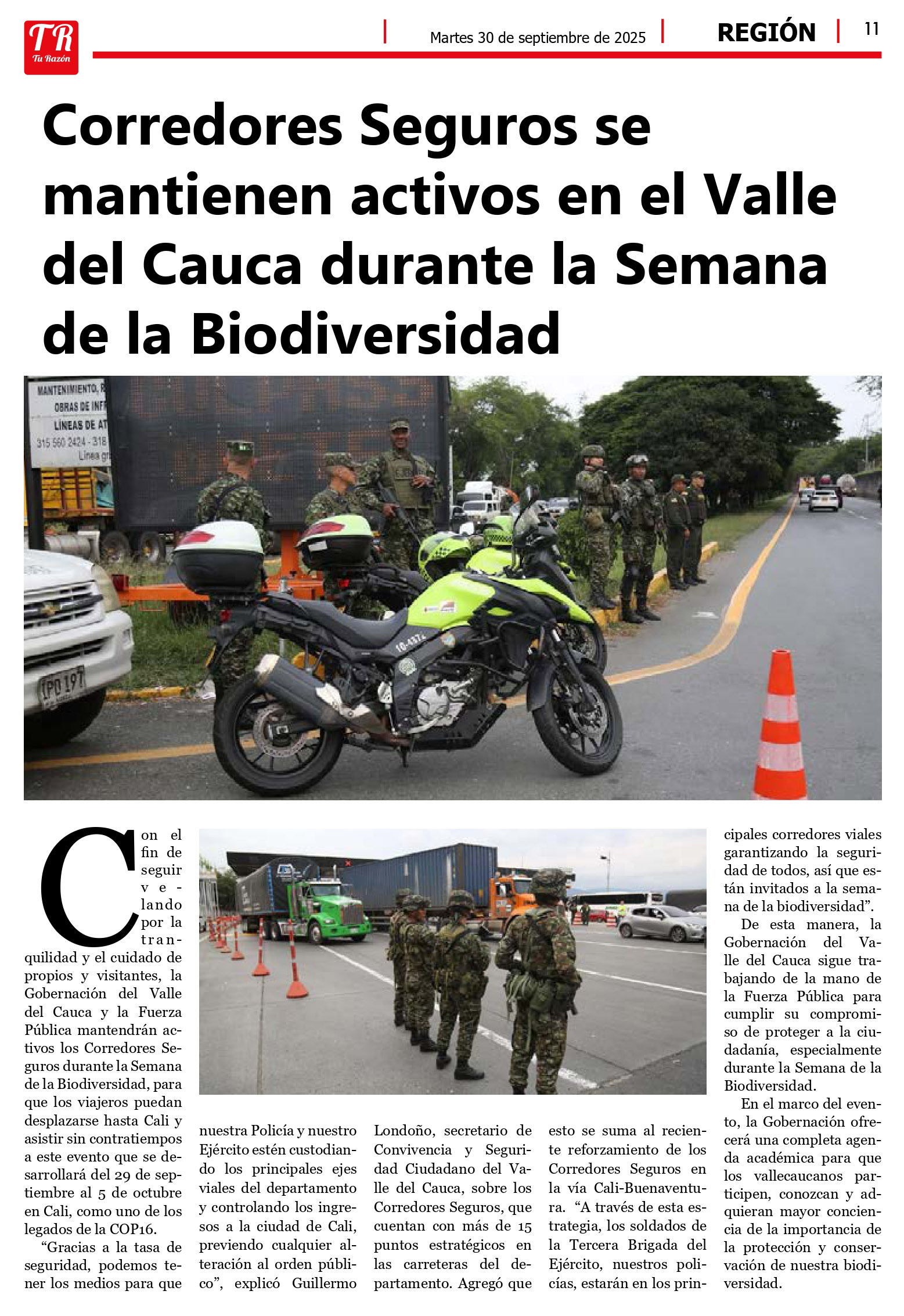 del Cauca y la Fuerza Pública mantendrán activos los Corredores Seguros durante la Semana de la Biodiversidad, para que los viajeros puedan desplazarse hasta Cali y asistir sin contratiempos a este evento que se desarrollará