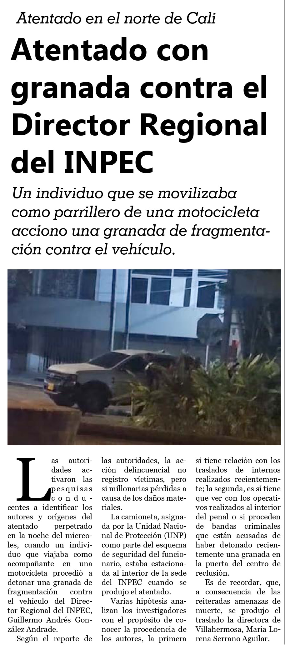 Atentado con granada contra el Director Regional del INPEC, Tu Razón