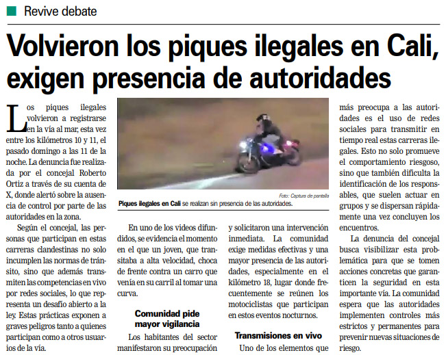 Según el concejal, las personas que participan en estas carreras clandestinas no solo incumplen las normas de tránsito, sino que además transmiten las competencias en vivo por redes sociales, lo que representa un desafío abierto a la ley.