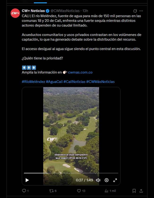 El río Meléndez, fuente de agua para más de 150 mil personas en las comunas 18 y 20 de Cali, enfrenta una fuerte sequía mientras distintos actores dependen de su caudal limitado. Acueductos comunitarios y usos privados contrastan en los volúmenes de captación, lo que ha generado debate sobre la distribución del recurso.