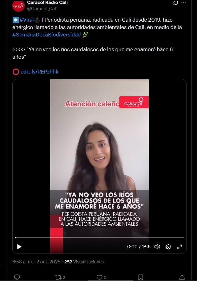 Periodista peruana, radicada en Cali desde 2019, hizo enérgico llamado a las autoridades ambientales de Cali, en medio de la Semana de la Biodiversidad, ya que afirma que ya no ve los ríos caudalosos de los que se enamoró hace 6 años. Pide a las autoridades tomar acciones para evitar esta situación.