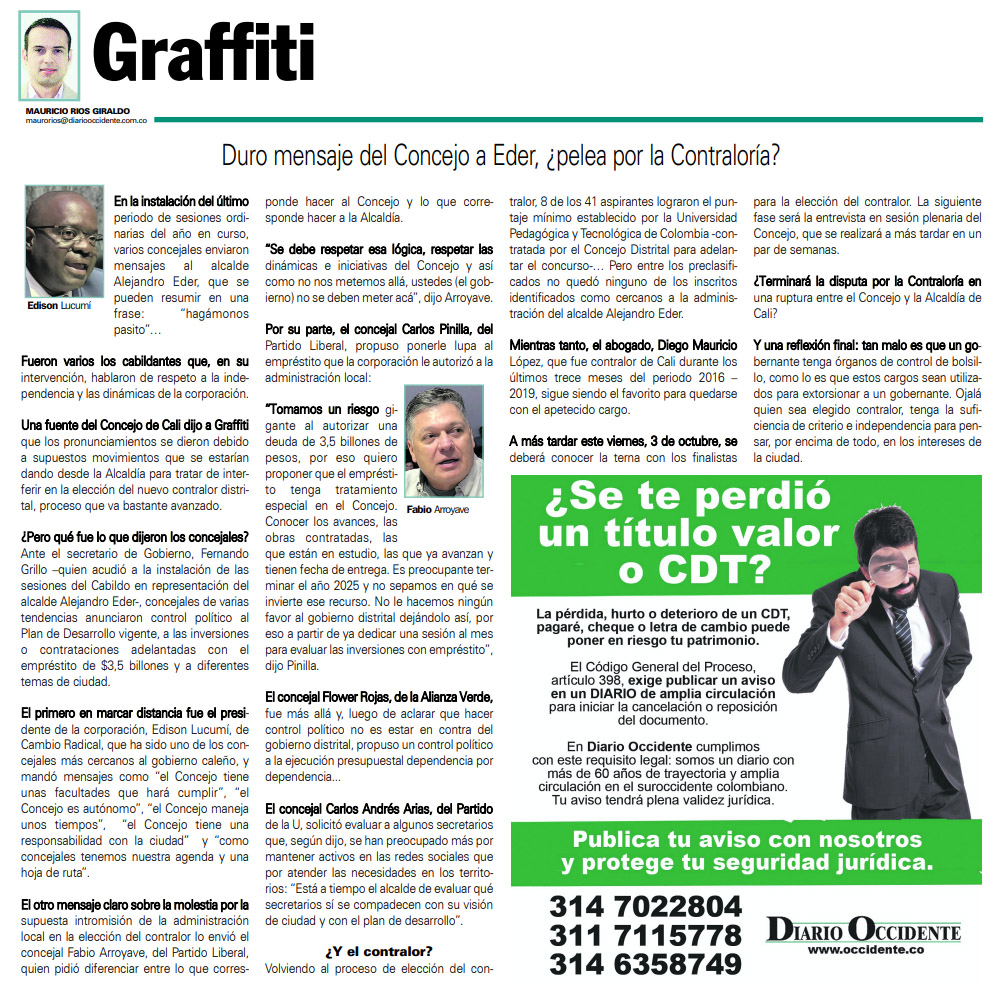 Una fuente del Concejo de Cali dijo a Graffiti que los pronunciamientos se dieron debido a supuestos movimientos que se estarían dando desde la Alcaldía para tratar de interferir en la elección del nuevo contralor distrital, proceso que va bastante avanzado.