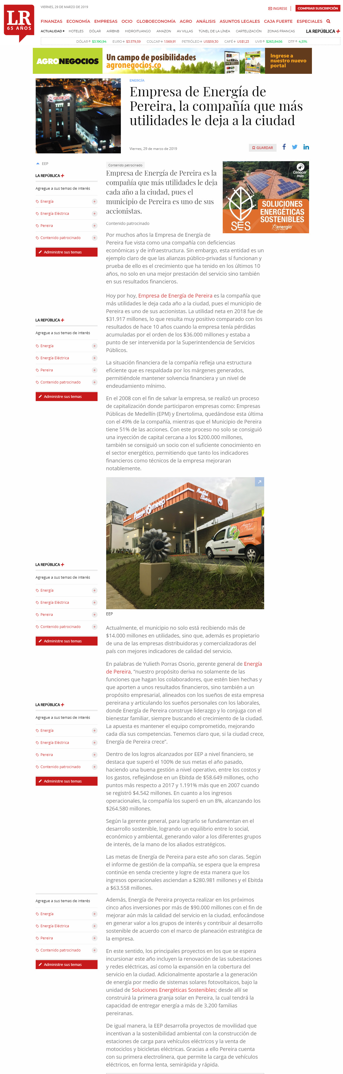 EMPRESA DE ENERGIA DE PEREIRA LA COMPAÑIA QUE MAS UTILIDADES LE DEJA A LA CIUDAD, LAREPUBLICA CO