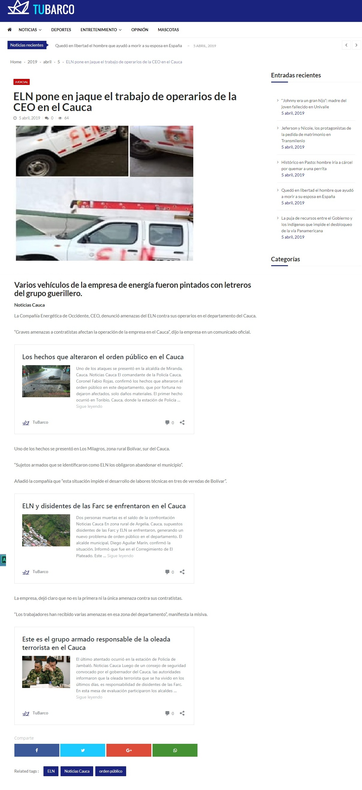 A través de un comunicado de prensa la Compañía Energética de Occidente denunció amenazas del ELN contra sus operarios en el departamento del Cauca.