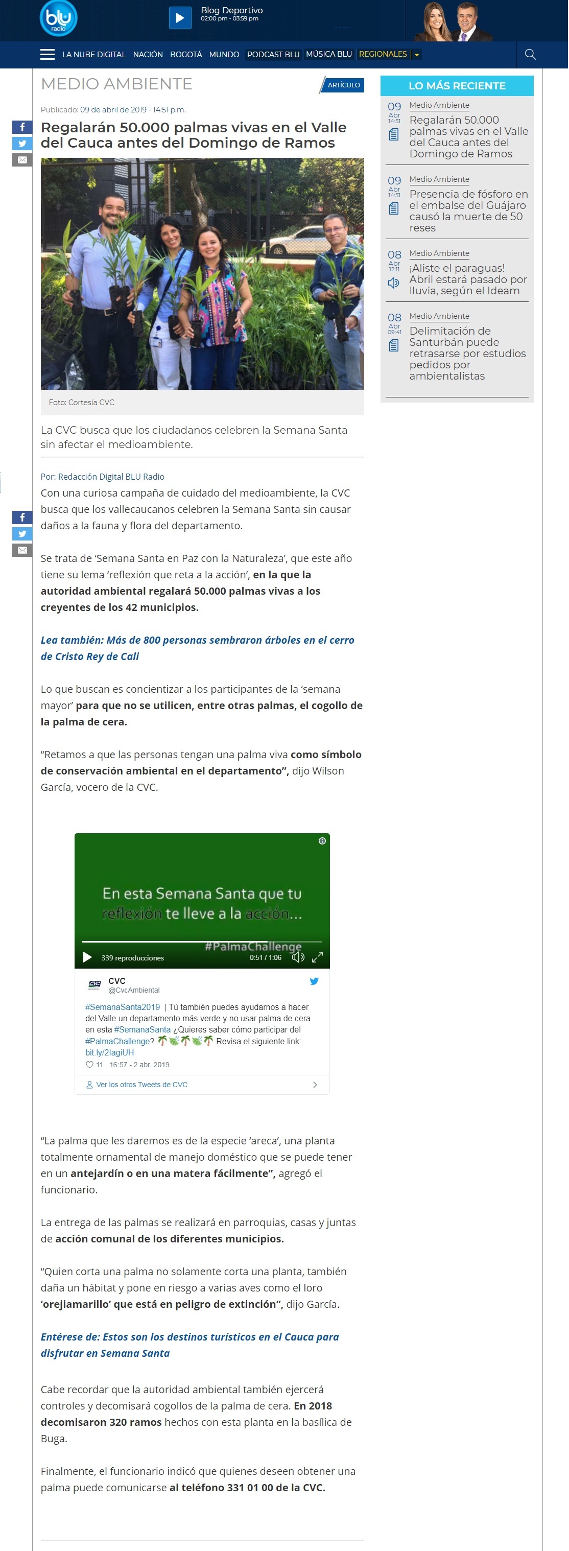 La CVC busca que los vallecaucanos celebren la Semana Santa sin causar daños a la fauna y flora del departamento. Por ello desarrolla la campaña ambiental ‘Semana Santa en Paz con la Naturaleza’, con la cual regalará 50.000 palmas vivas a los creyentes de los 42 municipios.