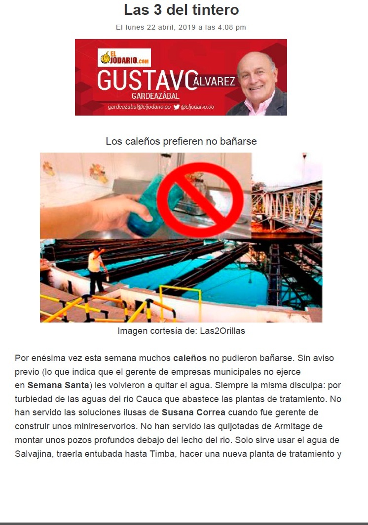 Columna de opinión de Gustavo Álvarez Gardeazabal donde analiza la problemática de abastecimeinto de agua potable para Cali cada vez que se presenta turbiedad del Río Cauca. Afirma que la única solución permanente es traer el agua desde La Salvajina, hacer una nueva planta de tratamiento y repartirla por gravedad. Pero les da culillo tener que hacer sociedad con lo paisas de la Epsa y Celsia.