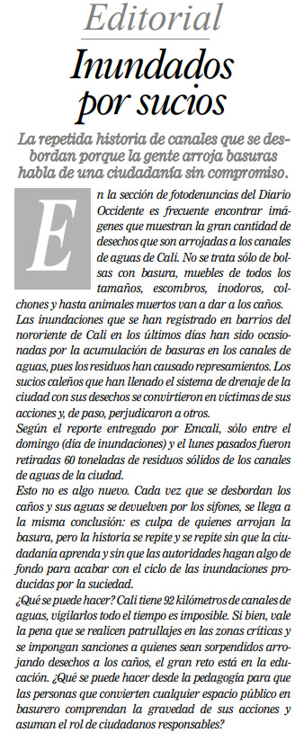 En la sección de fotodenuncias del Diario Occidente es frecuente encontrar imágenes que muestran la gran cantidad de desechos que son arrojadas a los canales de aguas de Cali. No se trata sólo de bolsas con basura, muebles de todos los tamaños, escombros, inodoros, colchones y hasta animales muertos van a dar a los caños. Las inundaciones que se han registrado en barrios del nororiente de Cali en los últimos días han sido ocasionadas por la acumulación de basuras en los canales de aguas, pues los residuos han causado represamientos. Los sucios caleños que han llenado el sistema de drenaje de la ciudad con sus desechos se convirtieron en víctimas de sus acciones y, de paso, perjudicaron a otros.