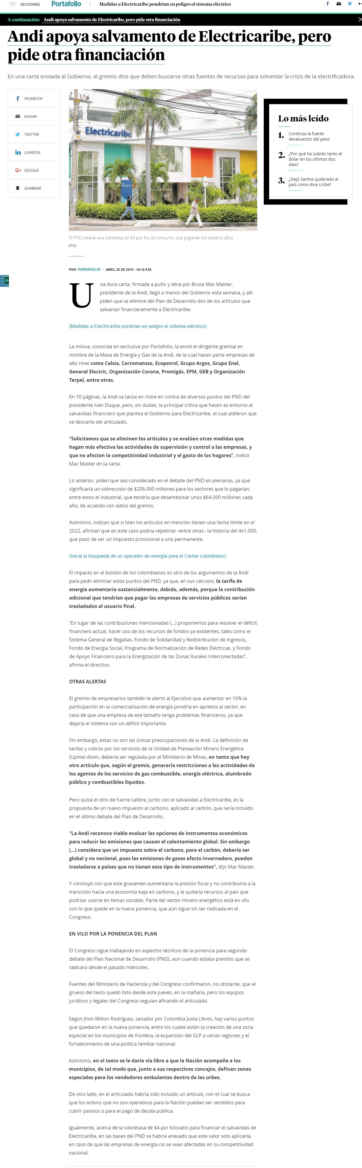Bruce MacMaster, presidente de la Andi, envió una carta al gobienro nacional pidiendo el retiro de dos artículos en el Plan de Nacional de Desarrollo que contemplan el salvamento de Electricaribe por considerarlos lesivos a la competitividad industrial y al gasto en los hogares.