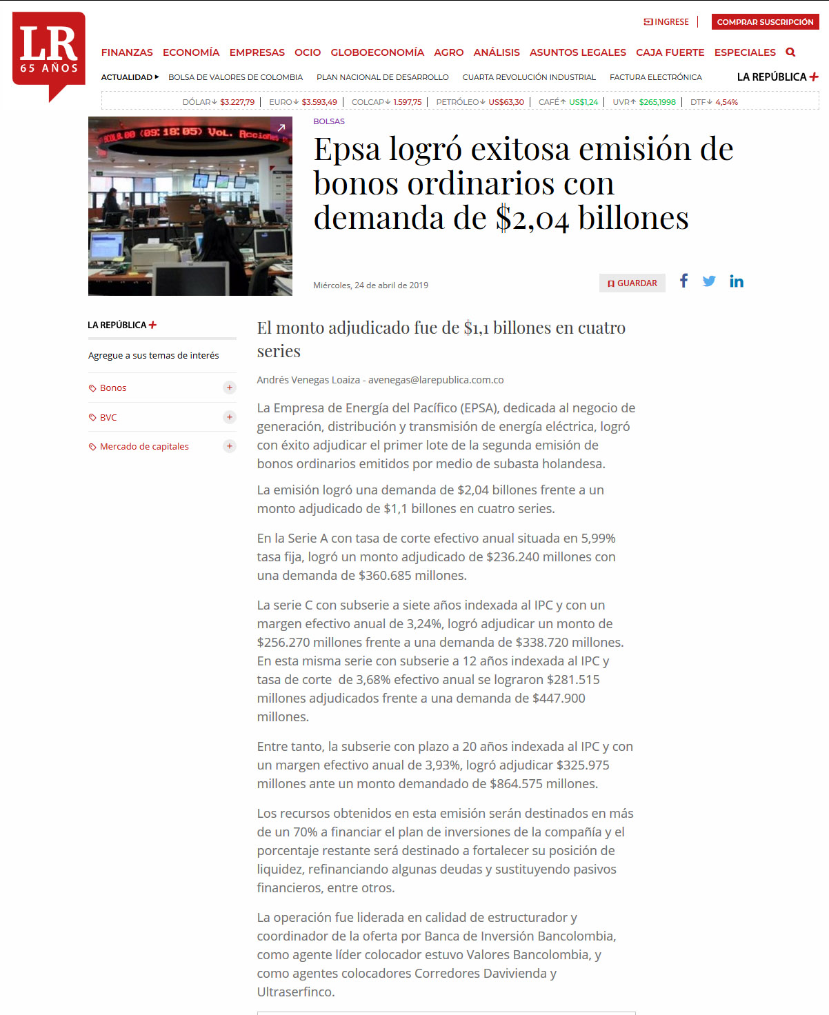 EPSA LOGRO EXITOSA EMISION DE BONOS ORDINARIOS CON DEMANDA DE $2 BILLONES, LAREPUBLICA CO
