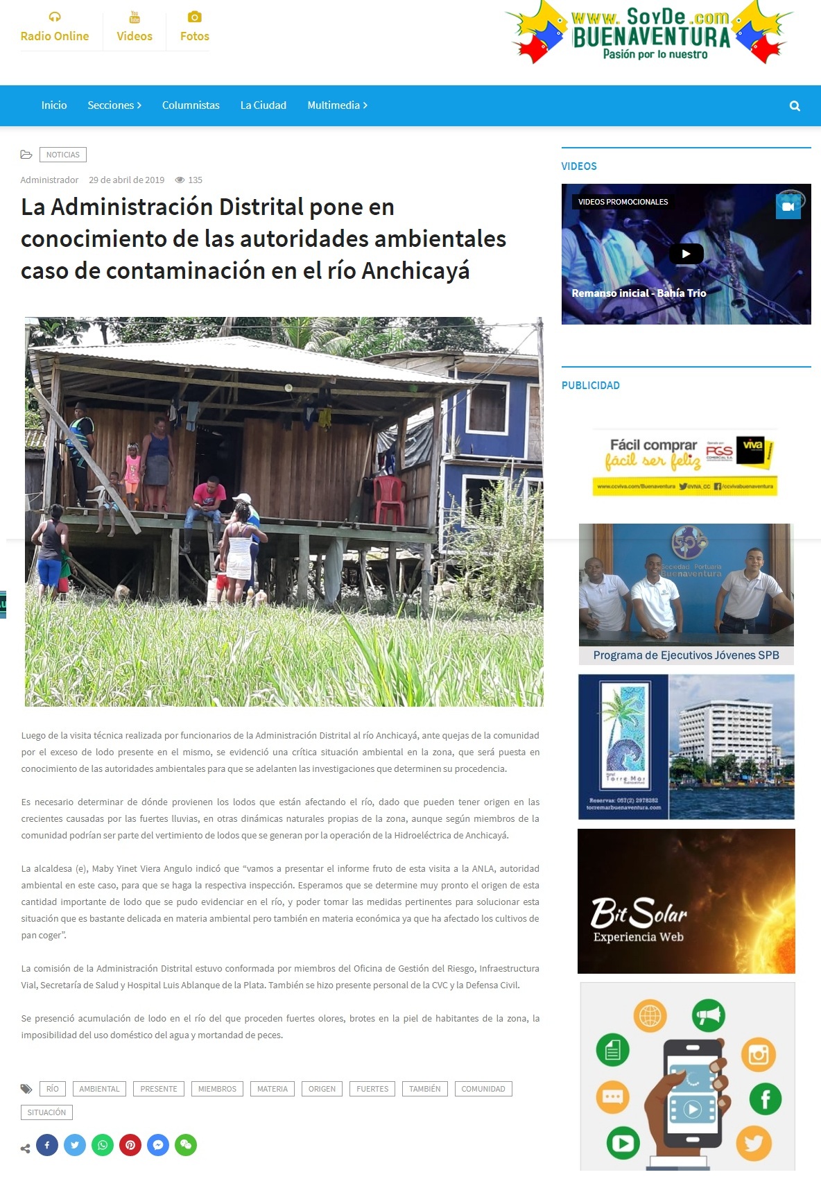Luego de la visita técnica realizada por funcionarios de la Administración Distrital al Río Anchicayá, se evidenció una problemática ambiental en la zona por el exceso de lodos presente en el río. Miembros de la comunidad afirman que se debe a la operación de la Central Hidroeléctria de Anchicayá. La visita será puesta en conocimiento de las autoridades ambientales para que se adelanten las investigaciones que determinen su procedencia.