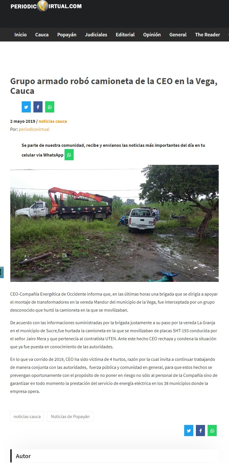 La Compañía Energética denuncia que en las últimas horas una brigada operativa que se dirigía hacia la vereda Mandur, La Vega fue interceptada por un grupo desconocido que hurtó la camioneta,