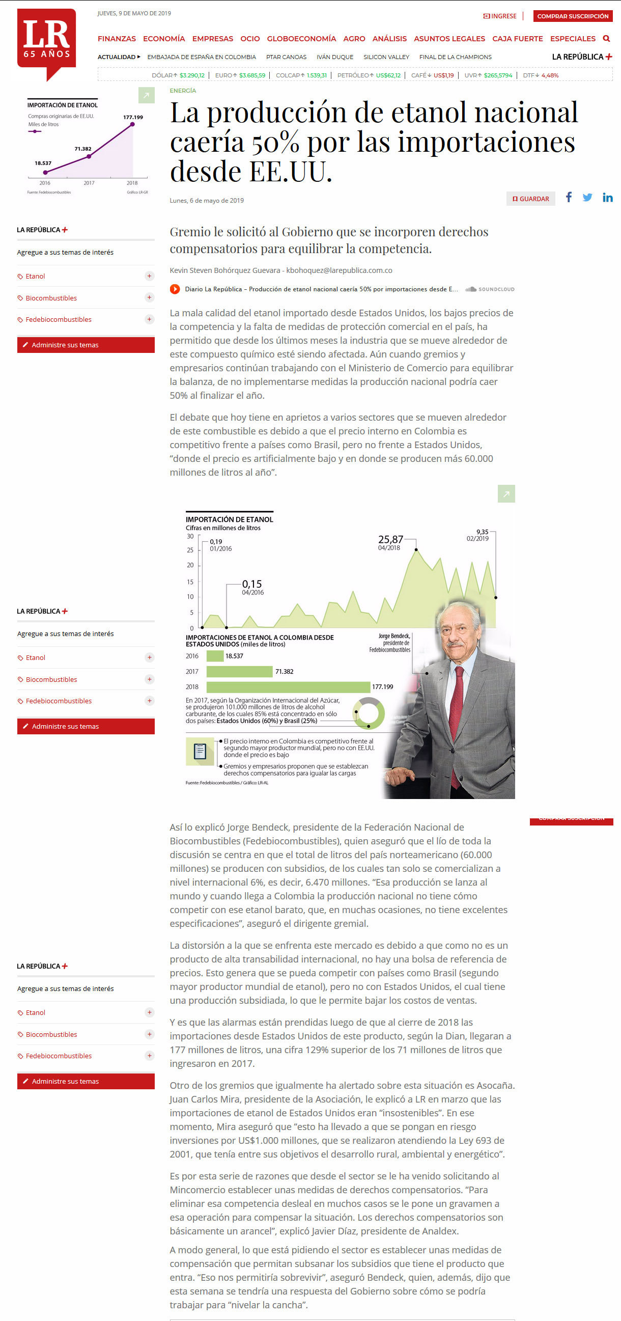 PRODUCCION DE ETANOL NACIONAL CAERIA POR LAS IMPORTACIONES DESDE EEUU, LAREPUBLICA CO