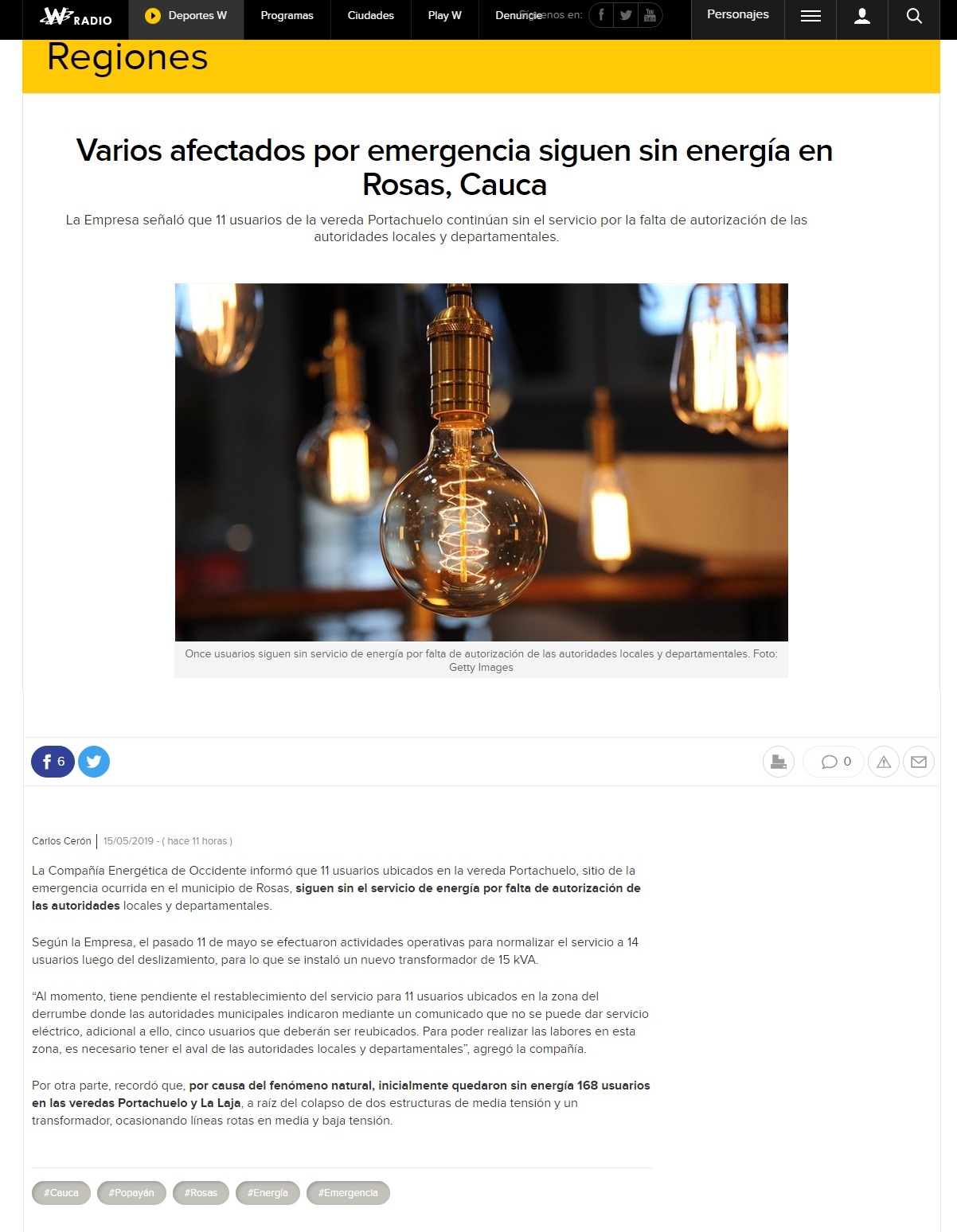 La Compañía Energética de Occidente informó que 11 usuarios ubicados en la vereda Portachuelo, sitio de la emergencia ocurrida en el municipio de Rosas, siguen sin el servicio de energía por falta de autorización de las autoridades locales y departamentales.