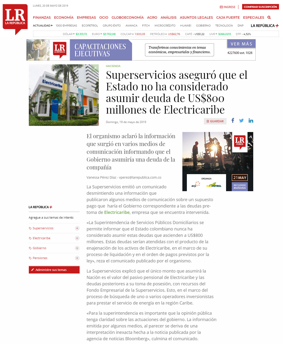 SUPERSERVICIOS - ESTADO NO HA CONSIDERADO ASUMIR DEUDA DE ELECTRICARIBE, LAREPUBLICA CO