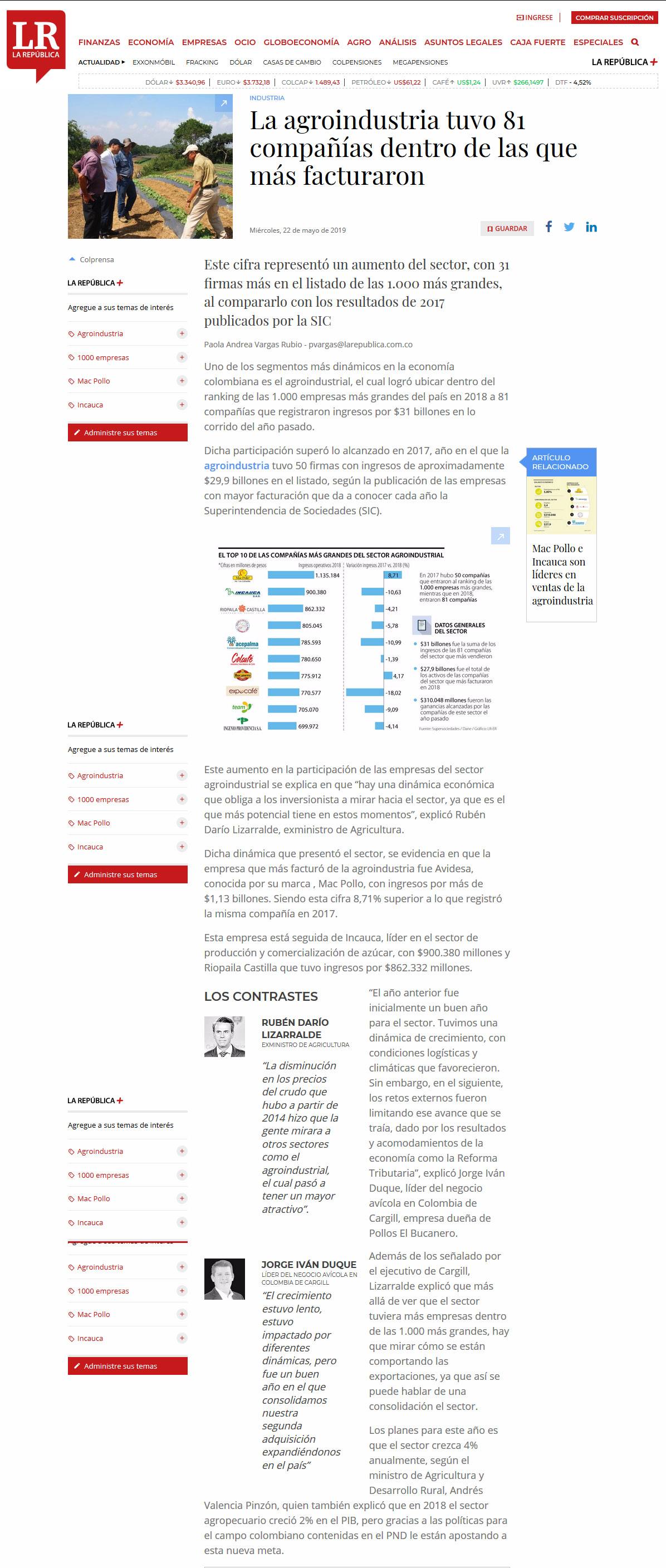 LA AGROINDUSTRIA TUVO 81 COMPAÑÍAS DENTRO DE LAS QUE MÁS FACTURARON, LAREPUBLICA CO