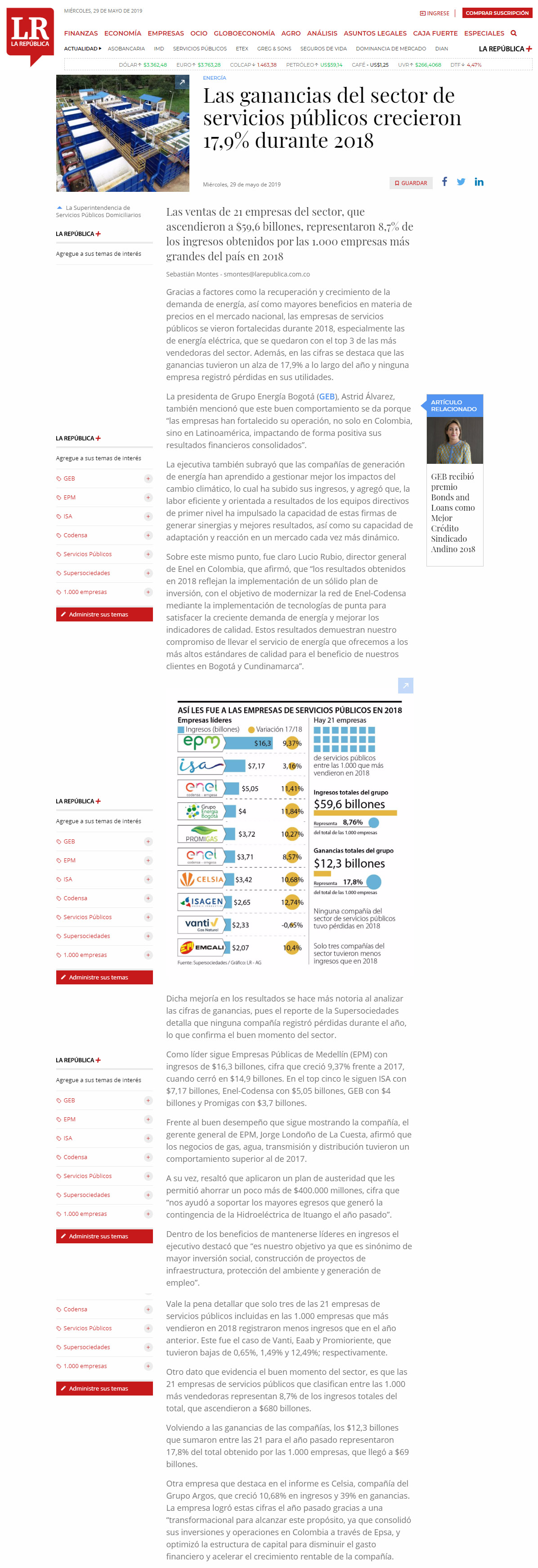 GANANCIAS DEL SECTOR DE SERVICIOS PUBLICOS CRECIERON 17,9% DURANTE 2018, LAREPUBLICA CO