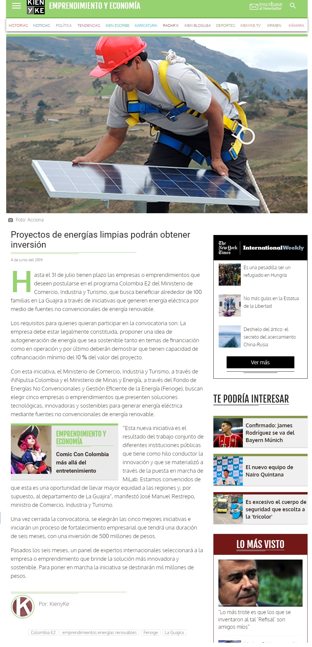 Hasta el 31 de julio tienen plazo las empresas o emprendimientos que deseen postularse en el programa "Colombia E2" del Ministerio de Comercio, Industria y Turismo, que busca beneficiar alrededor de 100 familias en La Guajira a través de iniciativas para la generación de energía eléctrica por medio de fuentes no convencionales de energía renovable.
