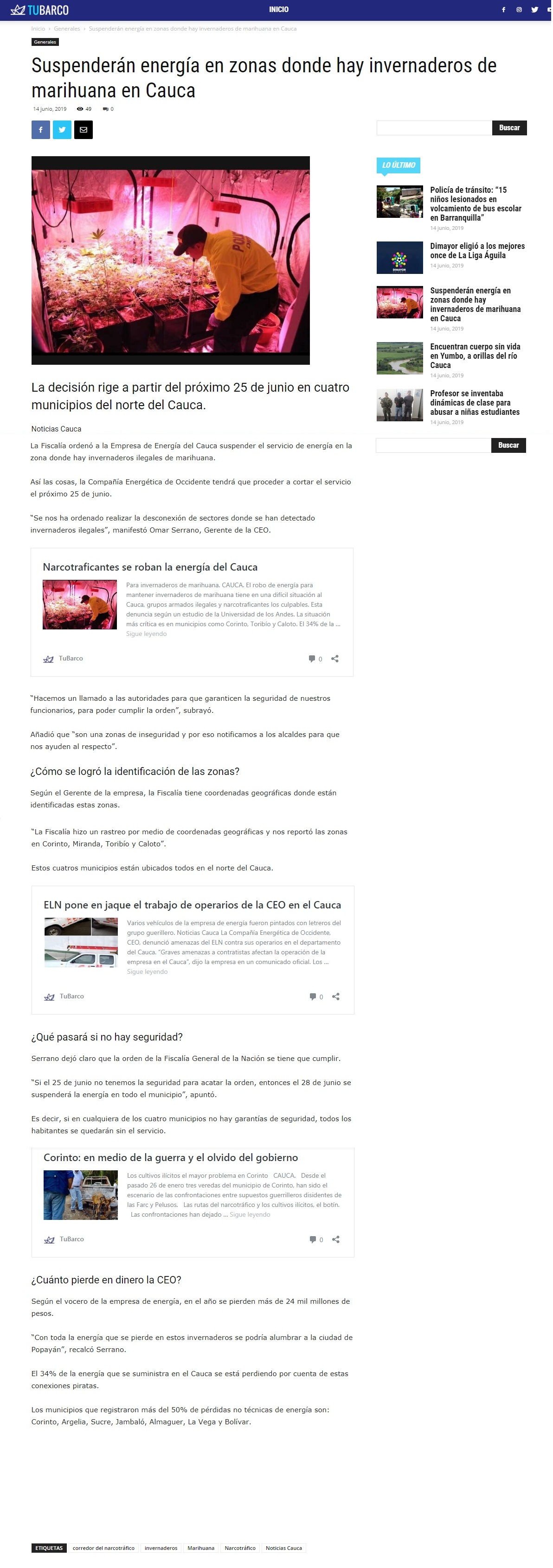 SUSPENDERÁN ENERGÍA EN ZONAS DONDE HAYAN INVERNADEROS DE MARIHUANA EN CAUCA