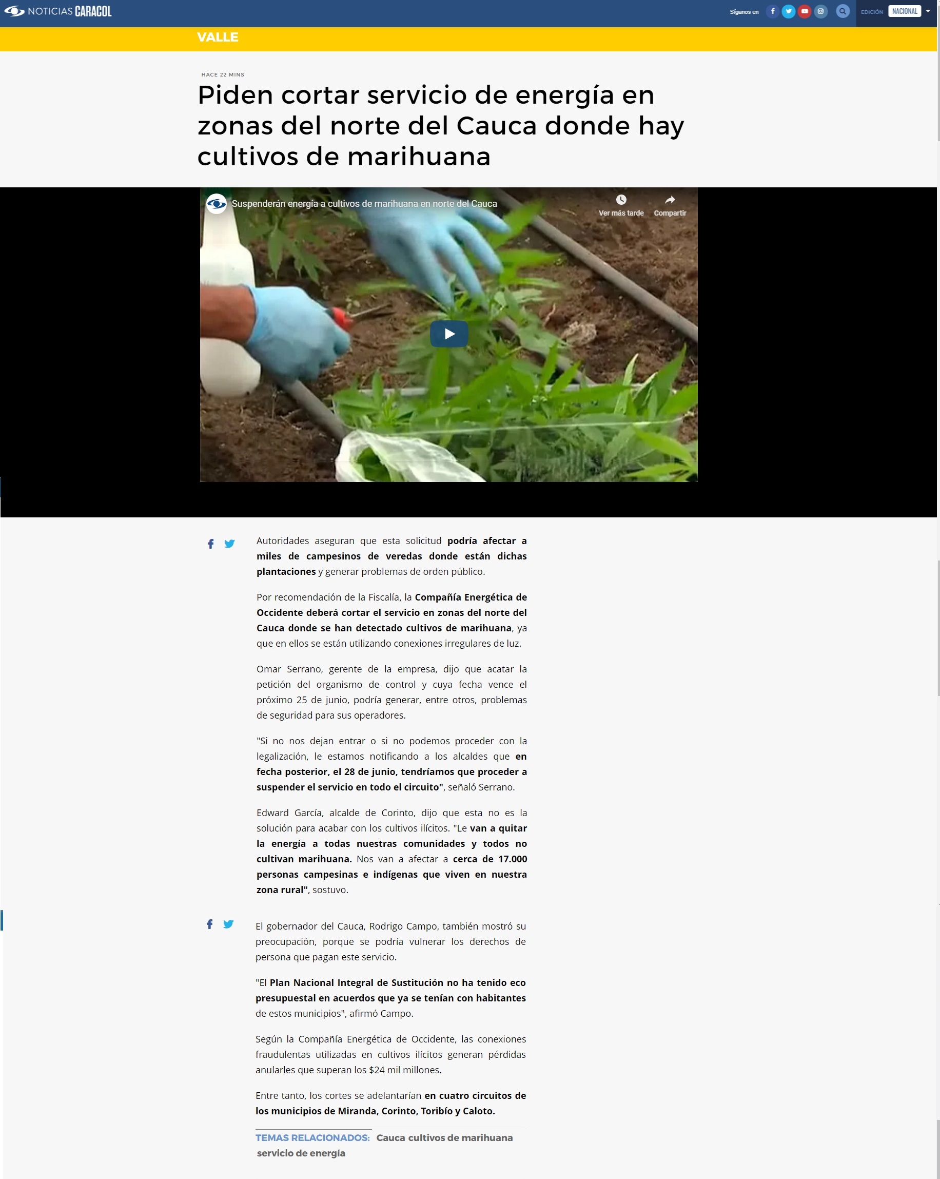 Por recomendación de la Fiscalía General de la Nación, la Compañía Energética de Occidente deberá suspender el servicio de energía en zonas del norte del Cauca donde se han detectado invernaderos de marihuana, ya que en ellos se están utilizando conexiones ilegales de energía. Edward García, alcalde de Corinto, dijo que esta no es la solución para acabar con los cultivos ilícitos y el gobernador del Cauca, Rodrigo Campo también mostró su preocupación.