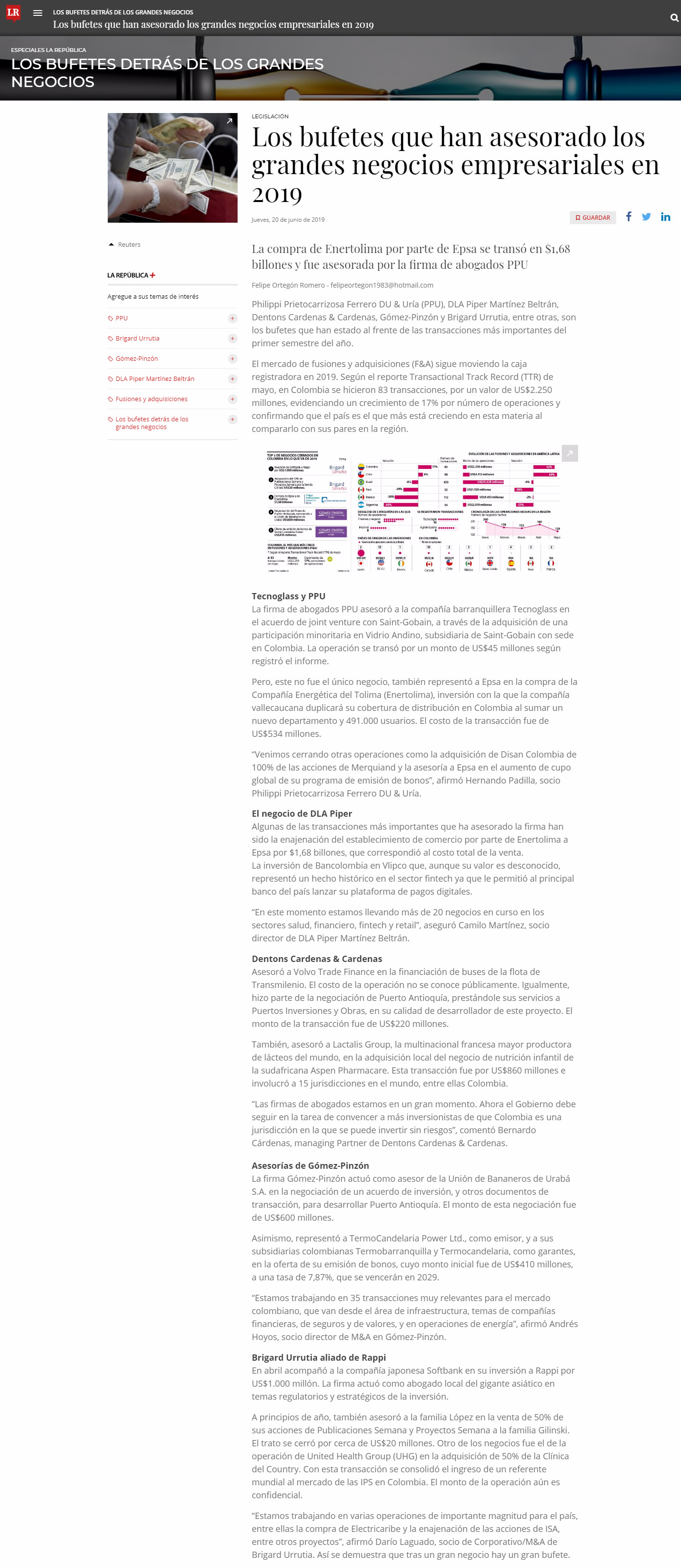 LOS BUFETES QUE HAN ASESORADO LOS GRANDES NEGOCIOS EN 2019, LAREPUBLICA CO
