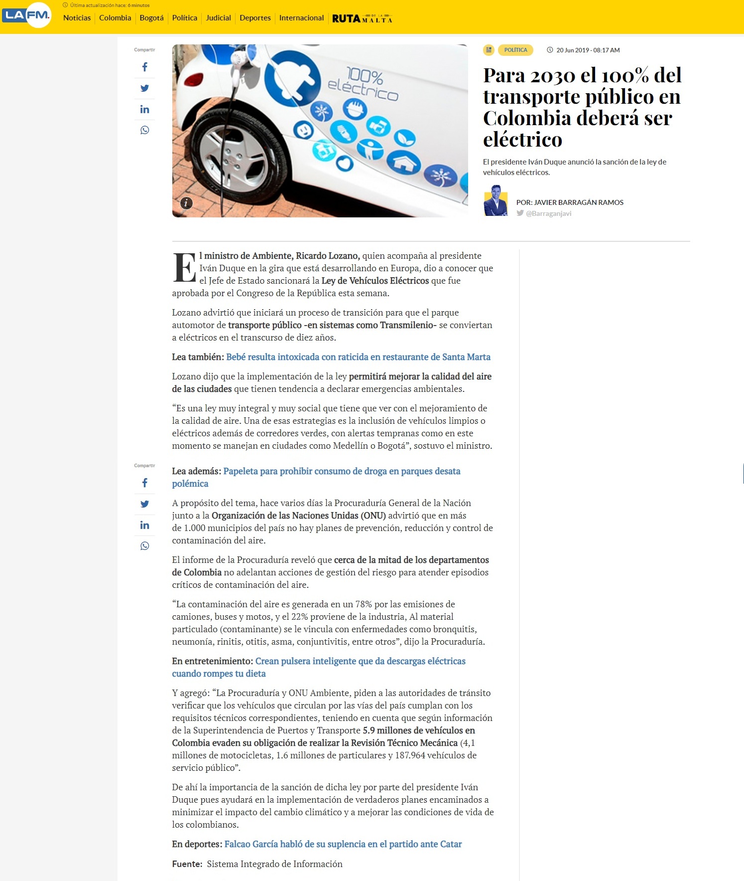 El ministro de Ambiente, Ricardo Lozano, quien acompaña al presidente Iván Duque en la gira que está desarrollando en Europa, dio a conocer que el Jefe de Estado sancionará la Ley de Vehículos Eléctricos que fue aprobada por el Congreso de la República esta semana.