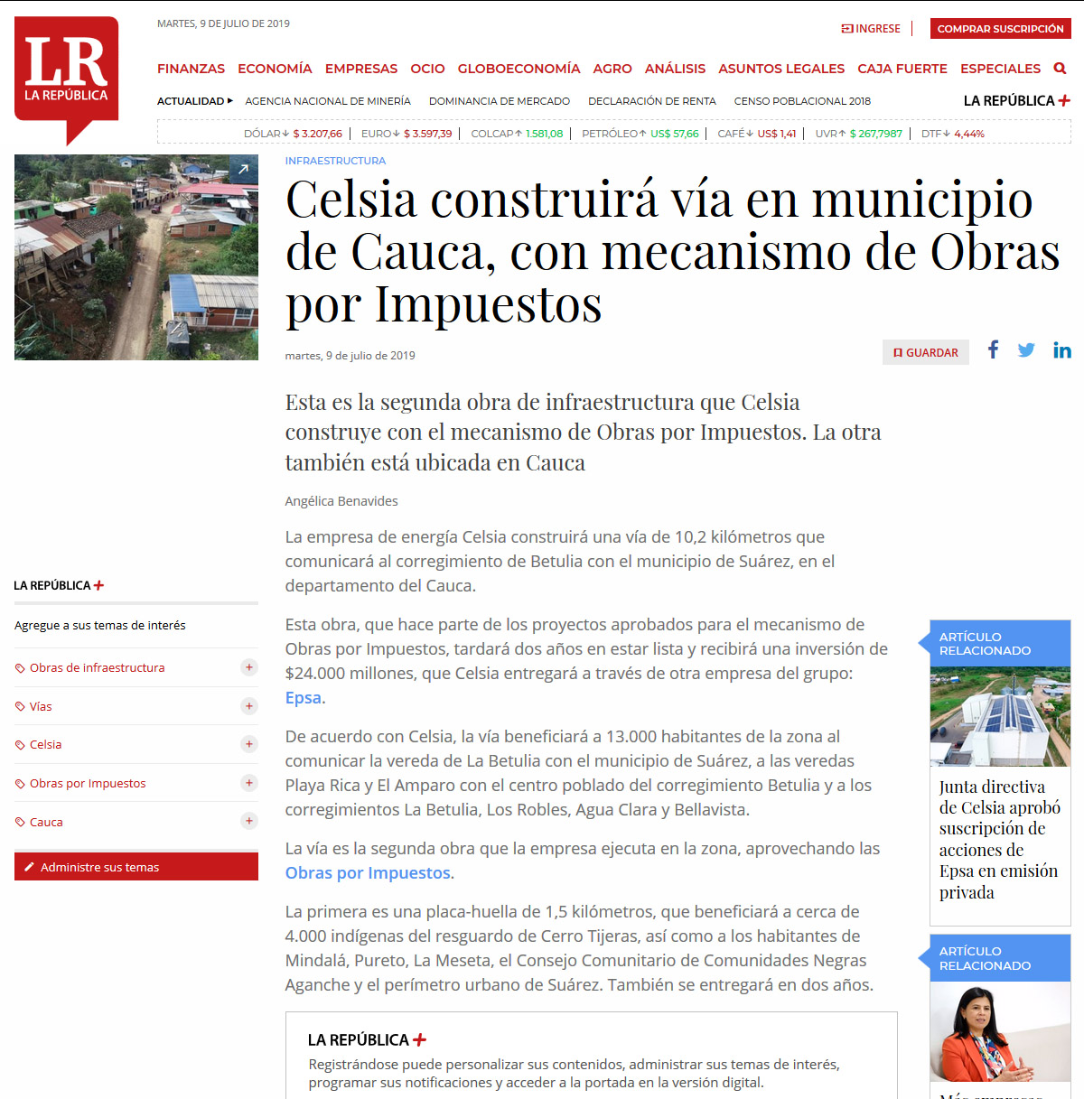 CELSIA CONSTRUIRÁ VÍA MUNICIPIO DE CAUCA, CON MECANISMO DE OBRAS POR IMPUESTO, LAREPUBLICA CO