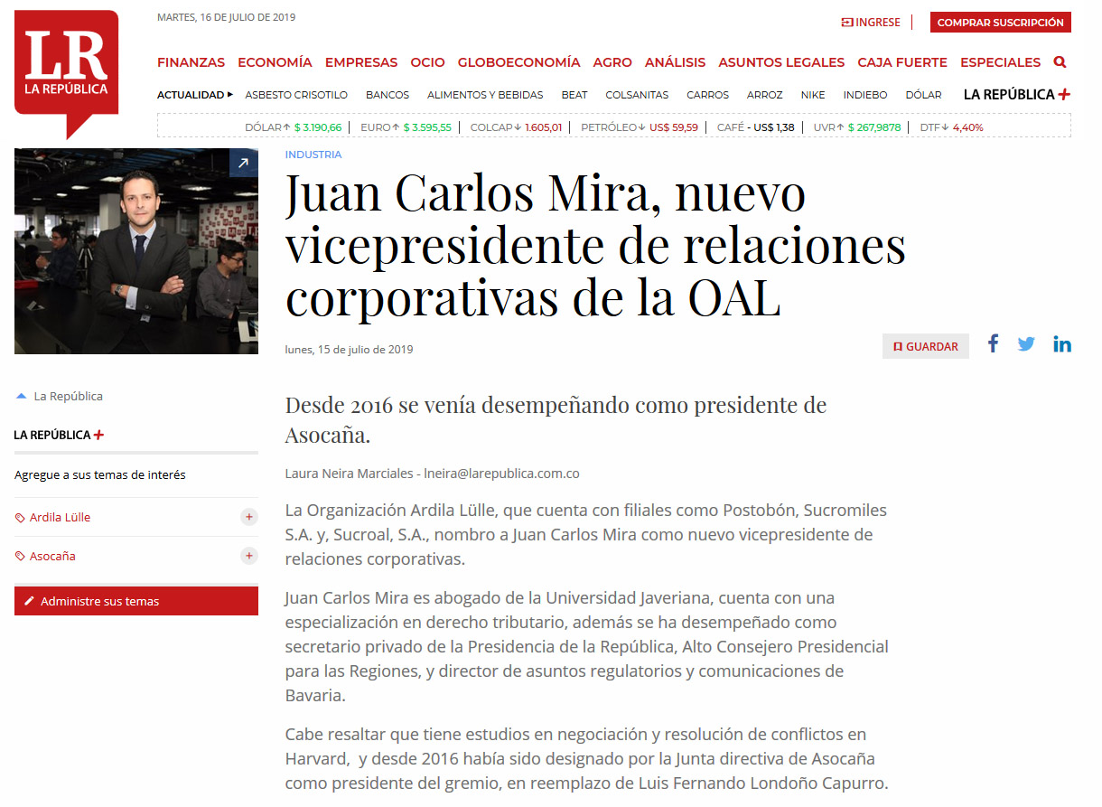 JUAN CARLOS MIRA, NUEVO VICEPRESIDENTE DE RELACIONES CORPORATIVAS DE LA OAL, LAREPUBLICA CO