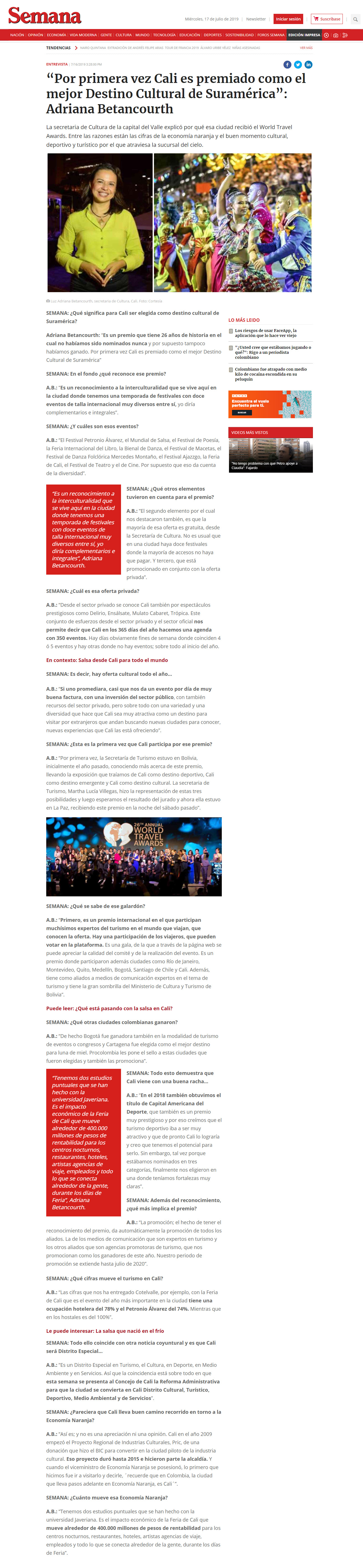 CALI ES PREMIADO COMO EL MEJOR DESTINO CULTURA DE SURAMÉRICA - ADRIANA BETANCOURTH, SEMANA COM