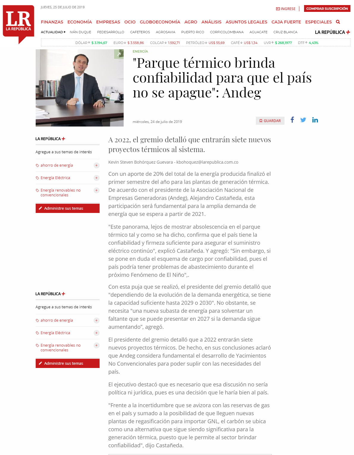 Con un aporte de 20% del total de la energía producida finalizó el primer semestre del año para las plantas de generación térmica. De acuerdo con el presidente de la Asociación Nacional de Empresas Generadoras (Andeg), Alejandro Castañeda, esta participación será fundamental para la amplia demanda de energía que se espera a partir de 2021.